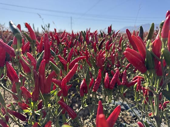 川椒辛簇,早熟半簇生朝天椒。株型紧凑,株高50cm,株幅50cm。小叶片,叶色深绿,植株抗性好。果长5.5cm,横径1.0cm,果尖钝圆,单果重约2.8克。嫩果绿色,成熟果红色,果面油亮。果皮厚籽多,干椒果面光亮,香辣味浓。