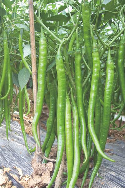 皱牛角1号,早熟长牛角椒。株高50-60cm,株幅55-60cm,果长25-30cm,果粗4.0cm,单果重52g。嫩果浅绿色,果面皱纹细密,品质好,辣味强烈,香辣细腻,口感无皮渣。丰产性突出,商品性优。抗病强,大棚种植经济效益显著。